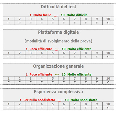 | Difficoltà test | Piattaforma digitale - Modalità di svolgimento della prova | Organizzazione generale | Esperienza complessiva | ||||||||||||||||||||